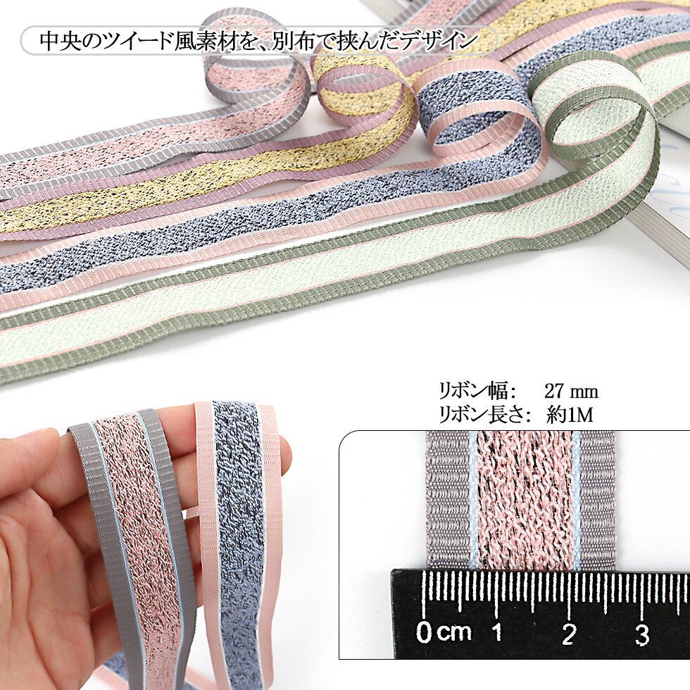 ITEM DETAIL 商品名: センターツイードテープ(r-009) サイズ: 長さ約1M 幅約2.7cm カラー: 1)イエロー系 2)ブルー系 3)ピンク系 4)グリーン系 ●このページはリボンの販売ページです。