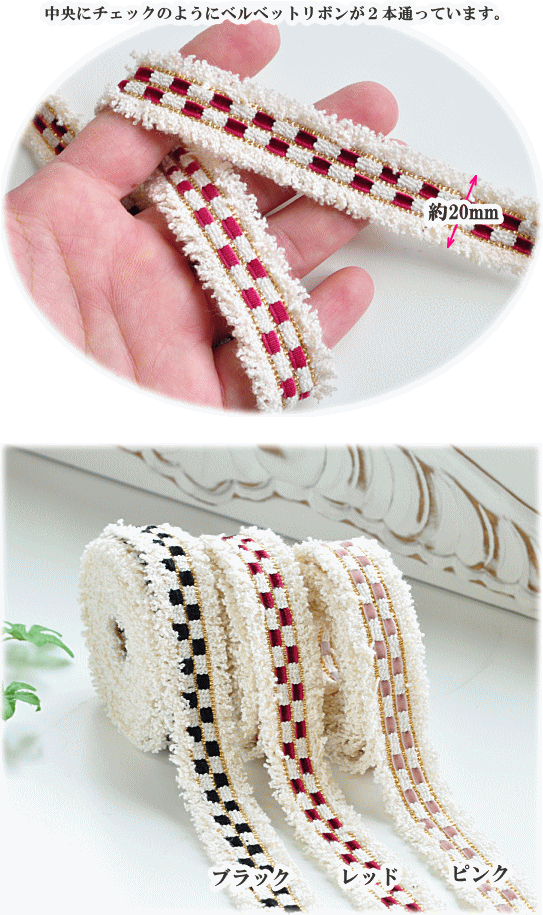 )ツイード リボン約20mm幅 5ヤード(約4.5m)全3色細いベルベットリボンがチェック模様のように編まれたツイードリボン。